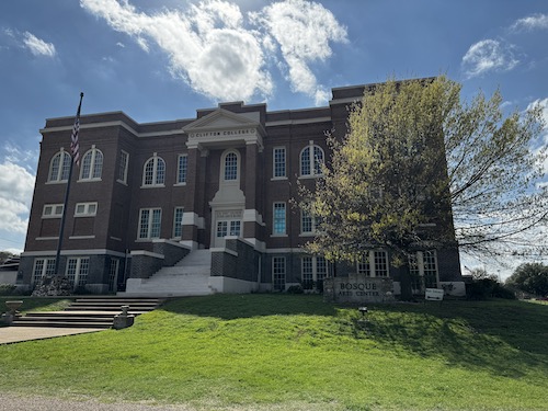 This building, built in 1923, was originally the administrative building for the Clifton Lutheran College founded in 1896. In 1942 a fire destroyed the college and only this building was left standing. It was later donated and became the Bosque Arts Center in 2009. Continual events and activities are happening all year round. Various groups, such as a book club, culinary club, quilt guild, and others meet there. Classes such as yoga, taekwondo, and piano are also offered.