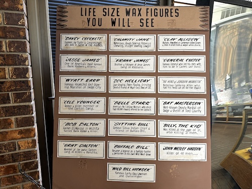 As for the Gunfighters Wax Museum, don’t expect it to be a Ripley’s Believe It or Not Museum. But it’s a fun little display with many of the old west personalities plus a few others on display. Since you’re there seeing the Teachers’ Hall of Fame anyway, you should make sure you check it out.