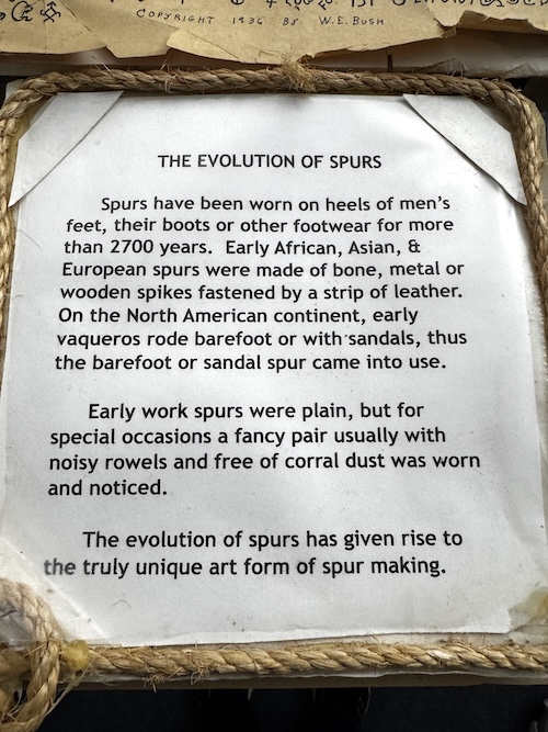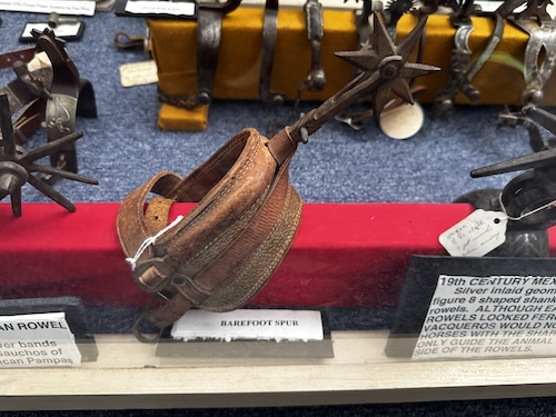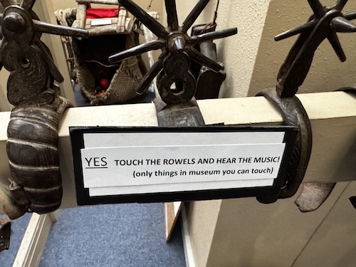 But once you discover this lovingly curated collection and take the time to see the differences and notice the details, you will become enchanted with their beauty. As you enter the museum, you can pick up a two-page document explaining the history and parts of spurs. Then you’ll be able to identify the parts as you peruse the collection. Later you’ll be able to knowledgeably talk about spurs with your family and friends.